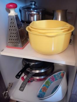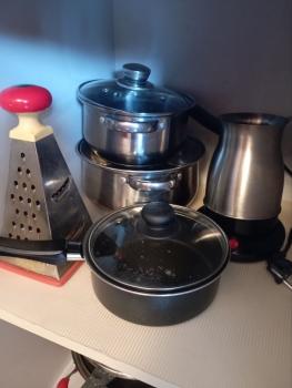 Кухня: холодильник, плита, СВЧ-печь, чайник, посуда, гарнитур, стол, посуда.