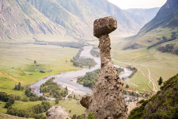 Здесь, в ущелье Карасу, где протекает одноименный приток Чулышмана, находятся каменные грибы необычные формы рельефа, образовавшиеся в результате избирательного вымывания (по-научному денудации) неоднородных горных пород. Выросли эти грибы примерно так: глыба из прочной породы служила своеобразным зонтиком для своего основания. Более мягкая порода вокруг основания размывалась осадками, а стебель рос, рос, рос... И так много-много лет.