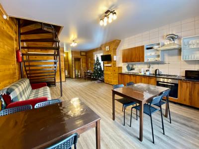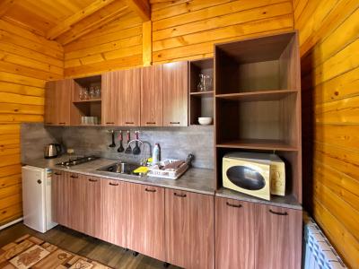 В нем оборудована кухня гостиная со всей необходимой посудой, холодильник, чайник, микроволновка, газовая плита, стол обеденный и диван книжка раскладывается, шкаф, телевизор. Санузел, душ, фен. И спальня с двуспальной кроватью, шкаф и стол между комнатами дверь.
