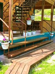 - На втором этаже — номер 3,4 общим балконом и прекрасным видом на горы. Около домика верандочка со столиком.