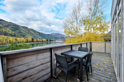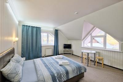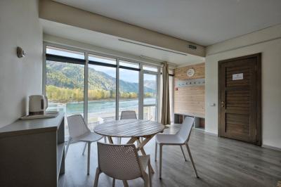Делюкс: они отличаются современным дизайном, отделкой натуральными материалами и замечательным видом на Катунь из панорамных окон. В каждом номере Делюкс есть небольшая кухня, холодильник, и все необходимое для комфортного отдыха. Дополнительные места расположены на антресолях, некоторые номера имеют выход на открытые террасы. Такие номера вмещают от двух до четырех человек.