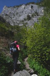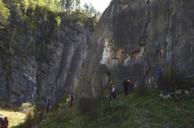 Заросшее зеленью ущелье переходит в отвесные скалы. Здесь часто тренируются скалолазы.