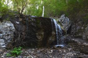 Поднявшись от водопада выше по тропе, вы сможете справа на одной из скал увидеть петроглифы. Петроглифы с тропы, конечно, не видно, ориентируйтесь на пятиконечную звезду красного цвета в желтом круге на скале. Это "современное искусство". Подойдите поближе и внимательно изучите скалу, вы увидите петроглифы, изображающие человека, горных козлов. Основная часть петроглифов относится к эпохе раннего железа (начало 1-го тыс. до н. э)