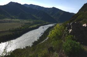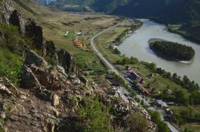 Искупавшись в водопаде, а затем, побывав в каменном ущелье и таинственной Долине духов, можно вернуться назад, попрощаться с водопадом и подняться на смотровую площадку, с которой открывается вид на Катунскую долину. На площадке стоит широкая удобная скамейка. Тут можно расположиться всей семьей, передохнуть и полюбоваться на замечательную панораму. Внизу протекает Катунь, видно Чемальский тракт, урочище Чечкыш. За рекой расстилается предгорье, покрытое зеленым ковром. Здесь можно увидеть всего лишь кусочек огромного тела Земли и ощутить ее силу и мощь!