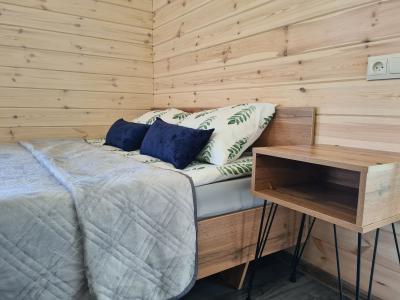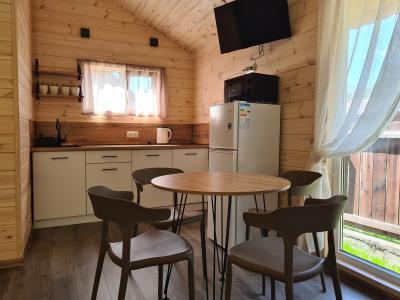 В домике двуспальная и односпальная кровать, кухонная зона со стойкой, газовая плита, холодильник, телевизор, комод.