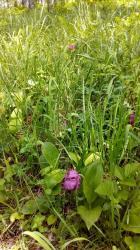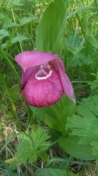 - Стебли высотой 25–50 см, крепкие, по всей длине густо опушенные короткими волосками. Листья в количестве 3–4 штук, крупные, широкоэллиптические, заостренные, охватывающие стебель своими основаниями, с хорошо выраженным жилкованием. Цветоносы обычно несут один (реже два) крупный цветок. Цветки очень эффектные, до 10 см в диаметре; листочки околоцветника окрашены в розовые, лилово-красные или малиновые тона с более темными жилками. Характерная особенность — вздутая губа в форме туфельки, длиной до 4–5 см, с небольшим отверстием сверху. В разгар цветения растение источает приятный аромат, напоминающий ваниль.