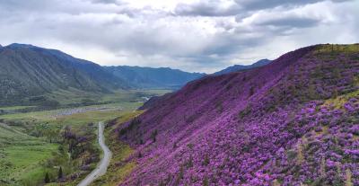 - Урочище Кур-Кечу, самое то место где все горы вокруг покрыты фиолетовым ковром Рододендрон Ледебура, в простанородье называемый маральник. Длительная остановка. Возможно мы попадем на национальные игры, Кок-бору, борьба Куреш и т.д которые проходят один раз в год, 2 мая.