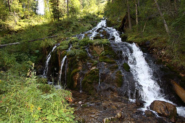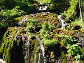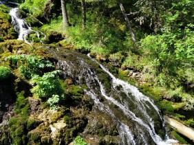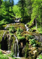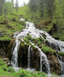 В самом низу водопад расходится на несколько струй, которые живописно стекают по мшистым камням.