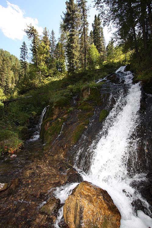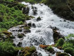 Вода водопада не стекает рекой с обрыва, а булькает на плоском ложе в середине горы! Затем идет первый каскад, который рассыпается широким веером. Потом вода единым потоком несется по мелким каскадам вниз.