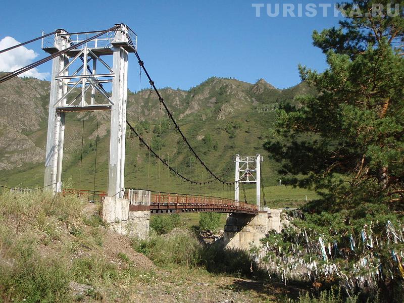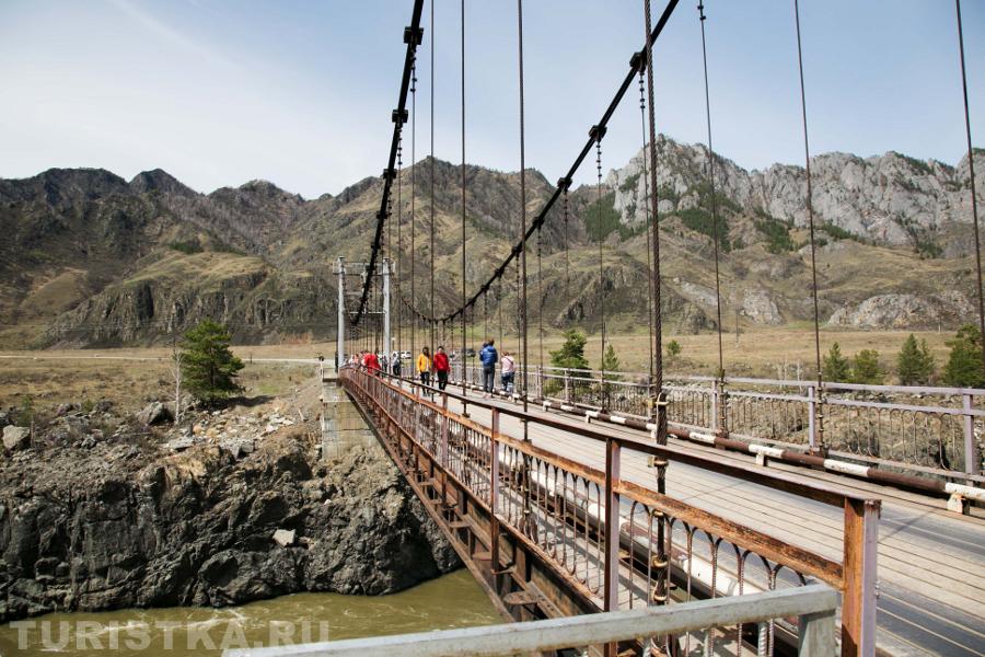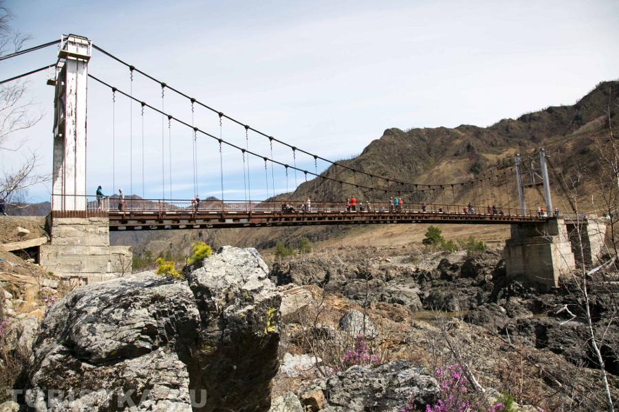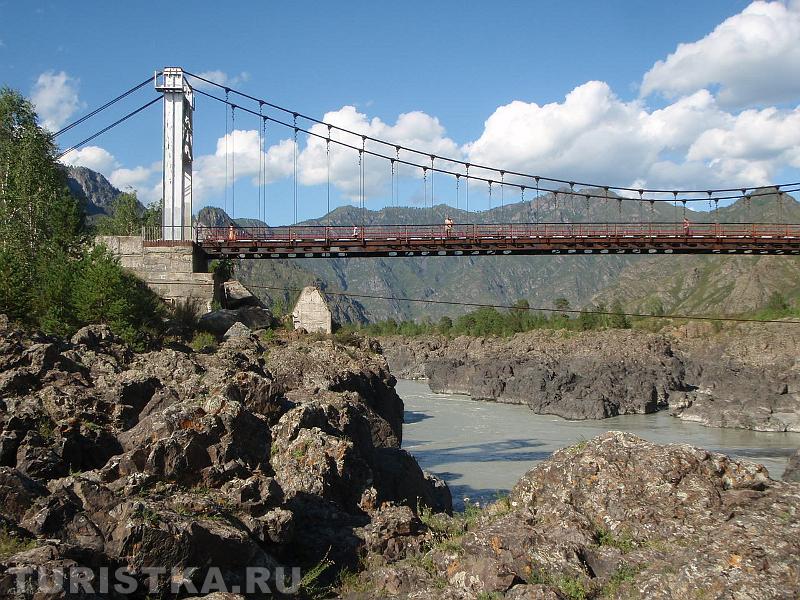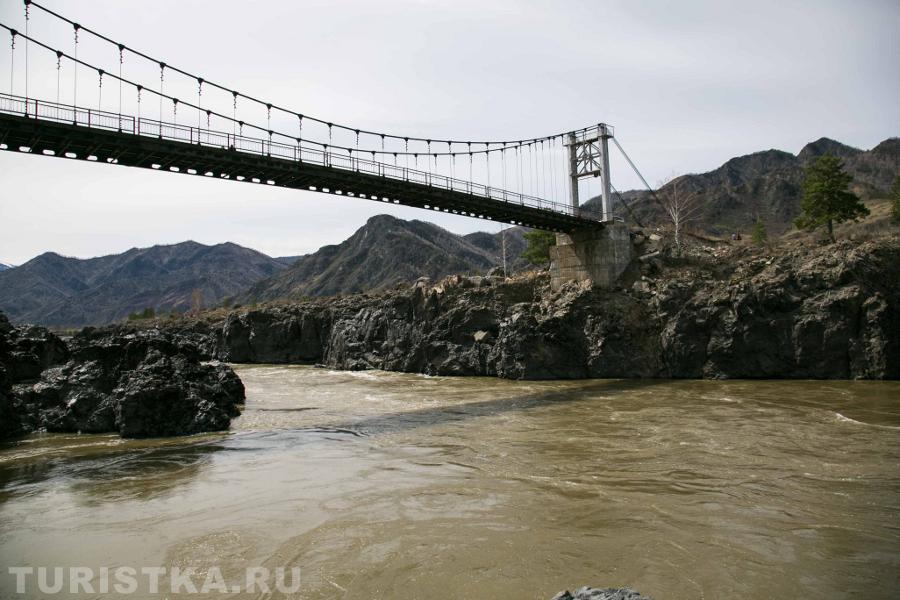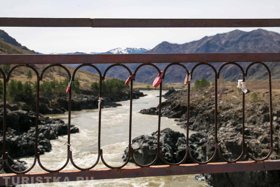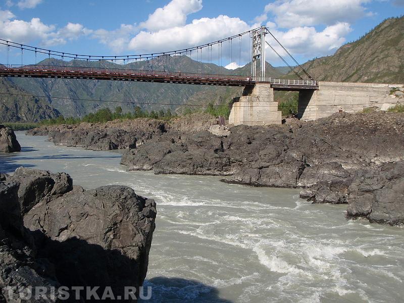 С моста отлично видны одни из самых красивых порогов Алтая Тельдекпеньские (так называемые Пни), по которым очень часто летом сплавляются водные туристы на рафтах, катамаранах и каяках в сторону Чемала.