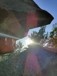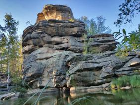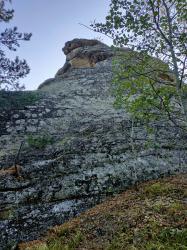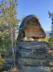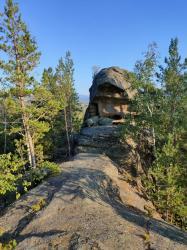 Самая высокая точка горы Очаровательной находится севернее грота это каменный массив конической формы, напоминающий башню, высотой примерно 10 метров. На нее можно осторожно взобраться по скальным выступам-ступеням. На башне есть «смотровая» площадка и глубокая лунка (диаметром около 1,5 метра, глубиной 0,6м). Отсюда открывается отличная панорама на окрестности на 20-25 км вокруг. Легко себе представить, как какой-нибудь кочевник во времена Джунгарского ханства с этого наблюдательного пункта внимательно осматривает окрестности, чтобы избежать встреч с неприятелем или стремится углядеть проходящий по Алтаю караван (в ту пору казахи-кочевники нередко захватывали путешественников в рабство). Еще одна «башня» (пониже первой) находится чуть ближе к гроту. На ней также есть площадка с лункой. Многочисленные лунки - результат тысячелетней деятельности сил природы.