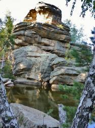 В северной части озера находится скала-останец с площадкой и гротом наверху. По каменистым выступам в северо-западной части этого массива можно забраться непосредственно к самому гроту. Издалека грот напоминает голову птицы, рыбы или фантастического зверя: видны «клюв» (или «пасть»), а также «глаз» в виде углубления в скале. Высота «клюва» более 5 м, а в самом гроте может поместиться компания из нескольких человек. Внутри грота аналогии с «пастью» продолжаются в центре лежит огромный камень с округлыми боковыми стенками, напоминающий «язык», стенки грота имитируют «щеки», переходящие в «зев» и «гортань» узкую щель между камнями, уходящую вглубь скалы. В дни равноденствия солнце появляется утром в пасти «чудовища» и исчезает вечером в ней же. Другой камень размерами более метра, находится в восточной части грота. Вверху грота имеется отверстие-лунка.