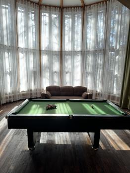 На первом этаже: большой холл с витражами: диван, пул, муз. центр, спутниковое ТВ, оборудованная кухня - два холодильника, э/плита, посудомоечная машина, мультиварка, микроволновая печь, чайник, комплект посуды, обеденная зона.