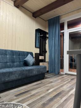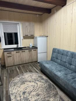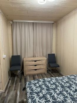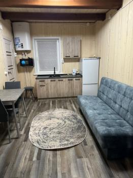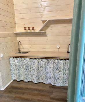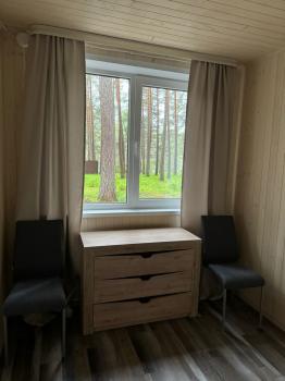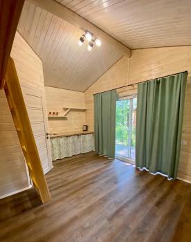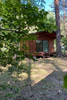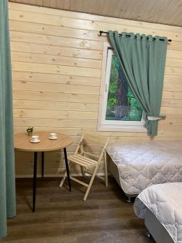 Просторный деревянный домик с панормной входной группой и террасой. В доме две комнаты, которые позволяют разместить до 4 гостей.