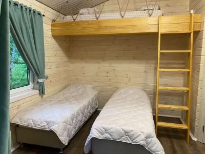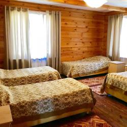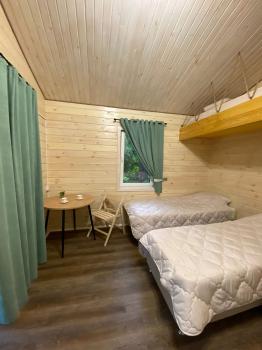В каждом домике: Двухспальная кровать / 2 односпальные кровати + кровать-чердак, туалетная комната, холодильник, чайник, плита, набор посуды, телевизор.