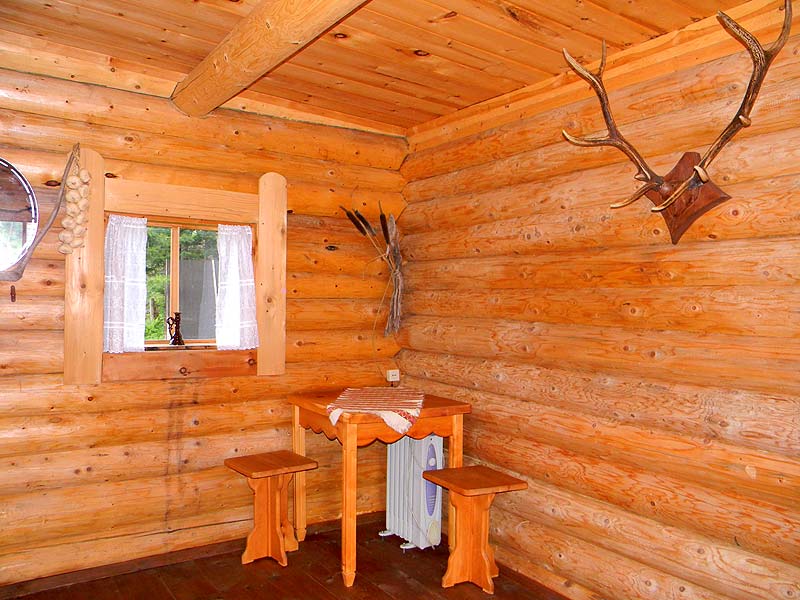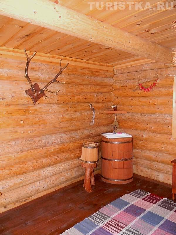 Бревенчатые стены, "курьи ножки" домика, интерьер комнаты, где раковина с холодной водой расположилась в бочке, все напоминает сказочную избушку.