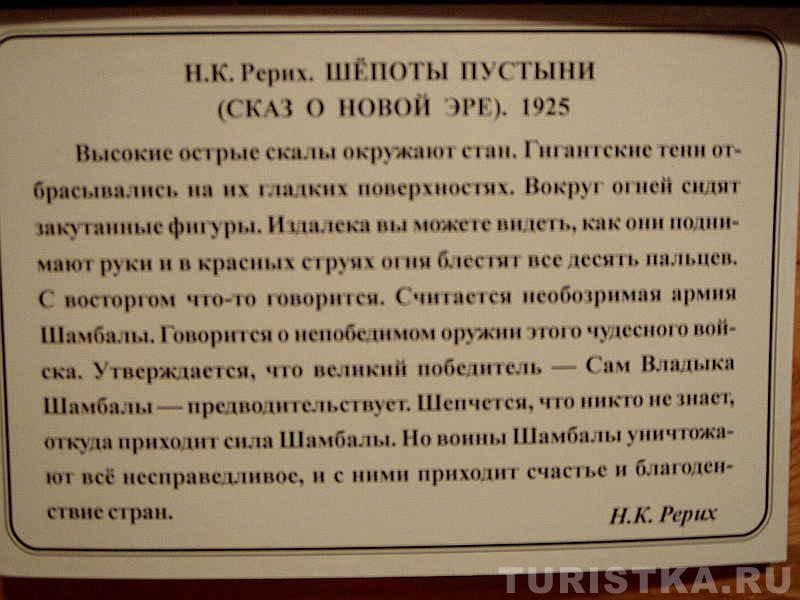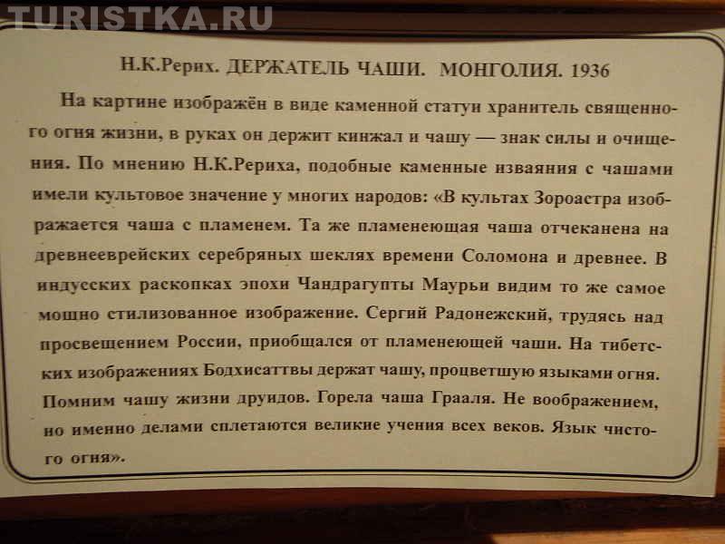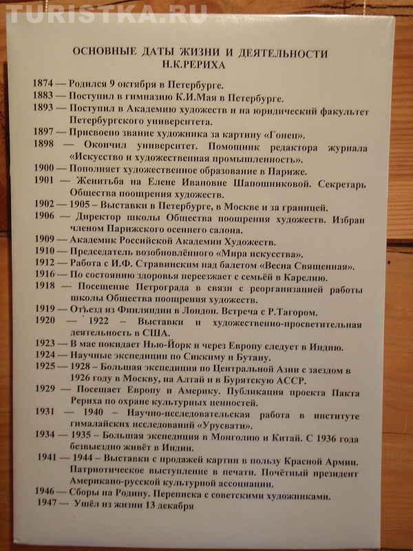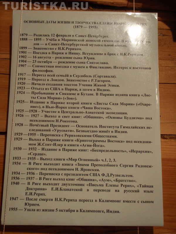 В двухэтажном доме-музее обаятельные экскурсоводы расскажут о жизненном пути великого художника и его необыкновенной семьи. Елена Ивановна Рерих жена художника была блистательной пианисткой, писала книги. Когда смотришь на ее портрет, который находится здесь же в музее, то не верится, что эта утонченная, аристократичная женщина наравне с мужчинами переносила тяготы Центрально-Азиатской экспедиции.