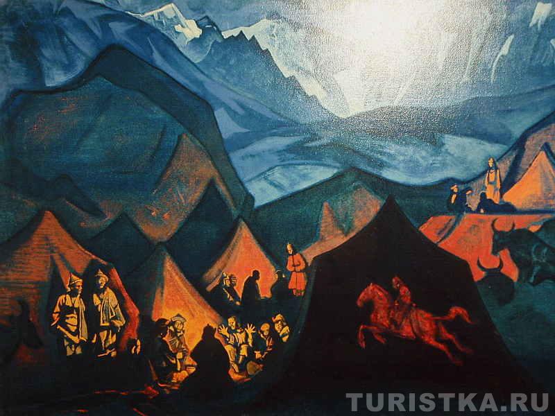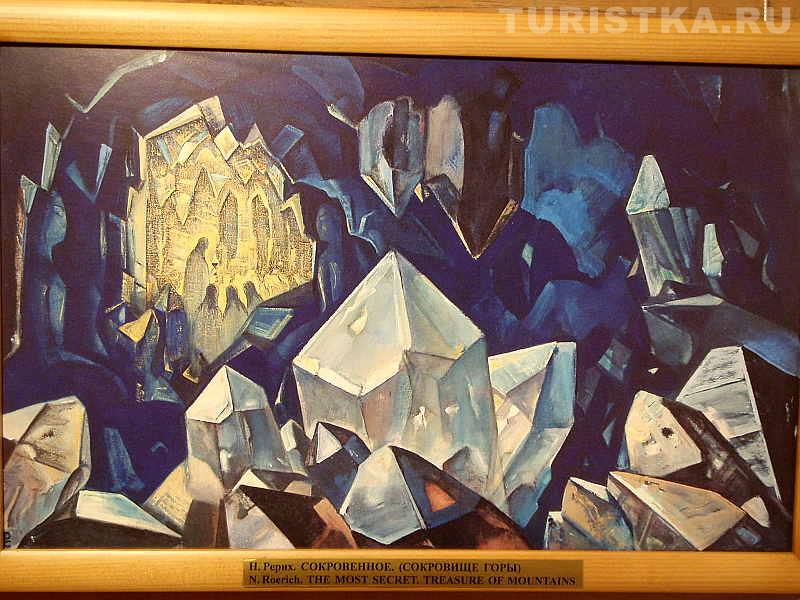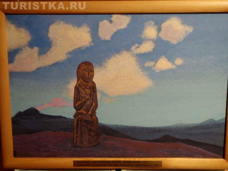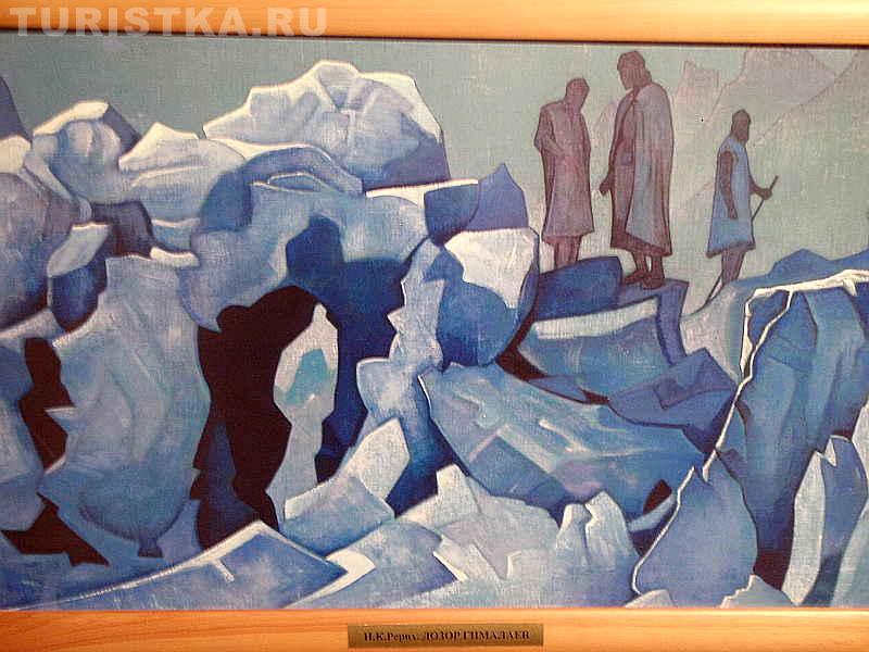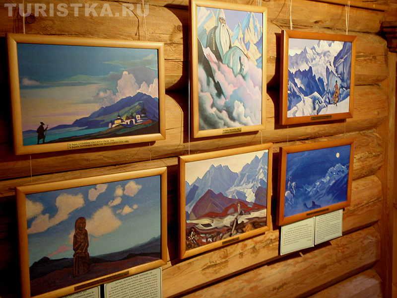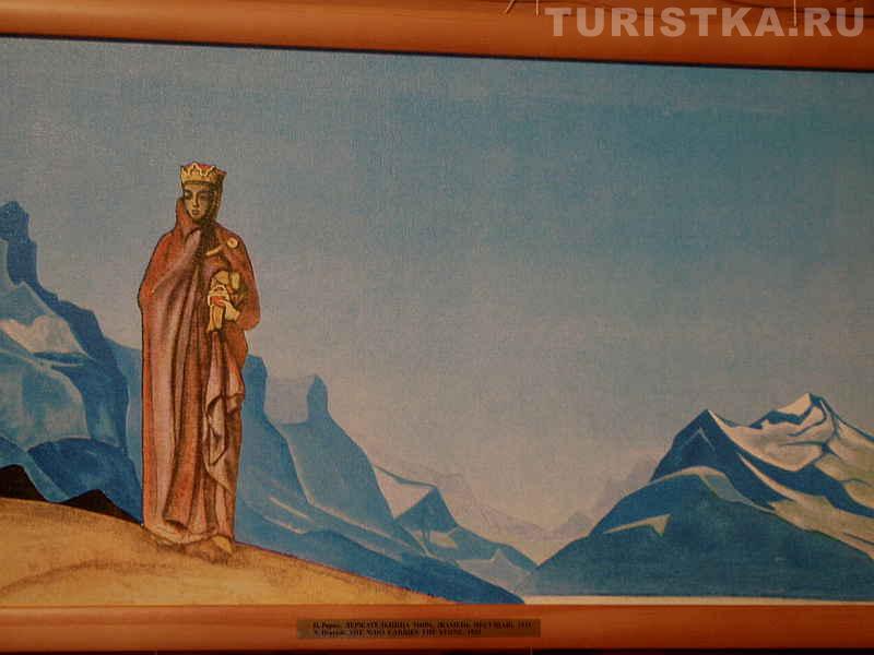 В доме-музее можно самостоятельно побродить по комнатам и посмотреть выставленные репродукции картин Рериха. Интересно ощущение, которое возникает, когда глядишь на картины, если ты недавно спустился с гор. Здесь не нужны комментарии экскурсовода, тут возникает прямая связь между тобой и изображением. Потому что ты только что видел подобное тому, что изображено на картине. Ты видел те же закатные и рассветные краски, видел, как причудливо узоры из трещин и выступов на горах складываются в силуэт человека или в лицо человека. И ты готов поверить, что эти силуэты вот-вот и оживут, проснутся, можешь поверить, что у гор есть духи-хранители. Ты входишь в резонанс с картиной. Это удивительно! Хочется сказать: "Да, точно, так и есть! Я видел это".