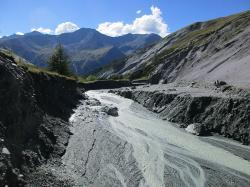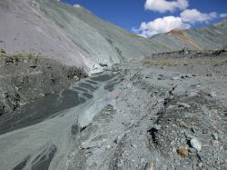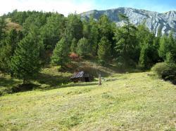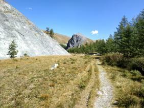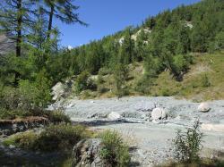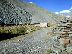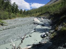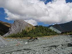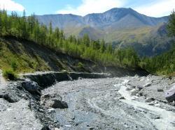На другом берегу надо перейти к речке Ярлу, которая впадает в реку Аккем, и подниматься вверх по ее течению. Речка наполняется водой из ручейков в ущелье Ярлу. Русло речки довольно широкое каменистое, сам же поток совсем небольшой. Речка имеет высокие обрывистые берега, поросшие лиственницей. Как только вы увидите справа тропинку вверх, поднимайтесь к лиственницам и идите по верхней тропе.