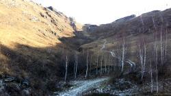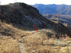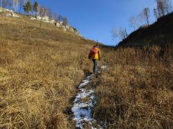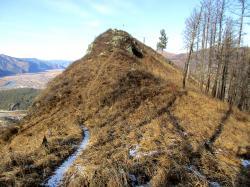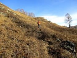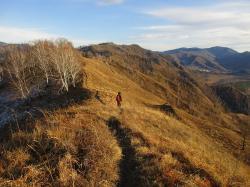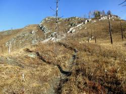 Путь к правому горбу начинается в лощине, затем выходит к скальному гребню, покрытому баданом, после этого хорошо видно справа от горба с флагом скальный выступ с березами, идем к нему. От этого выступа хороший вид на Катунь, здесь можно посидеть и отдохнуть. Остался последний подъем к гребню горы Верблюд. Затем налево по гребню идем к горбу с флагом. Подъем возможен до поздней осени, до выпадения снега, так как из-за крутизны склона по снегу будет скользко идти.