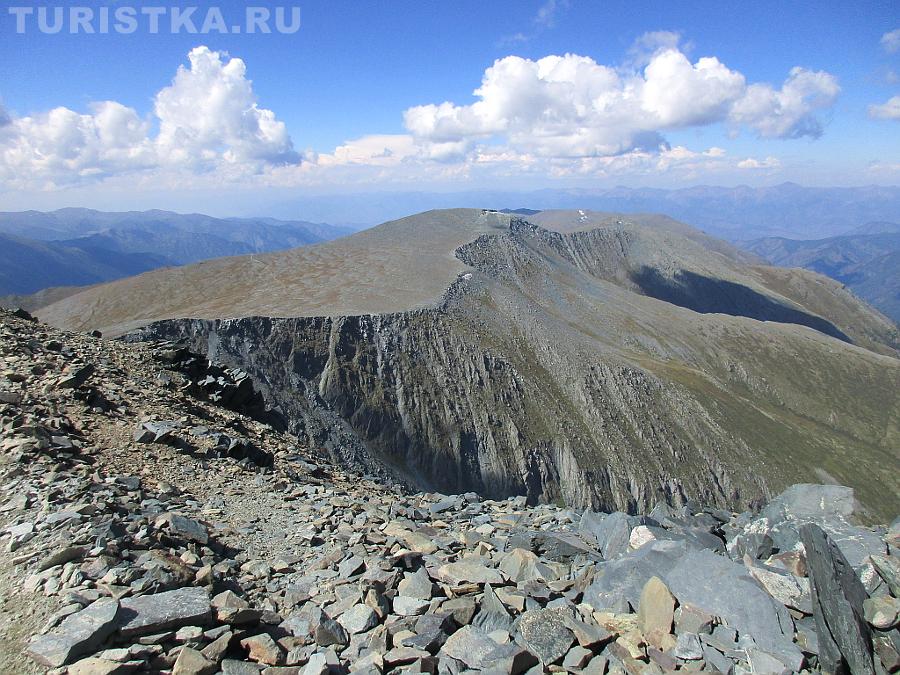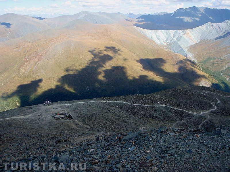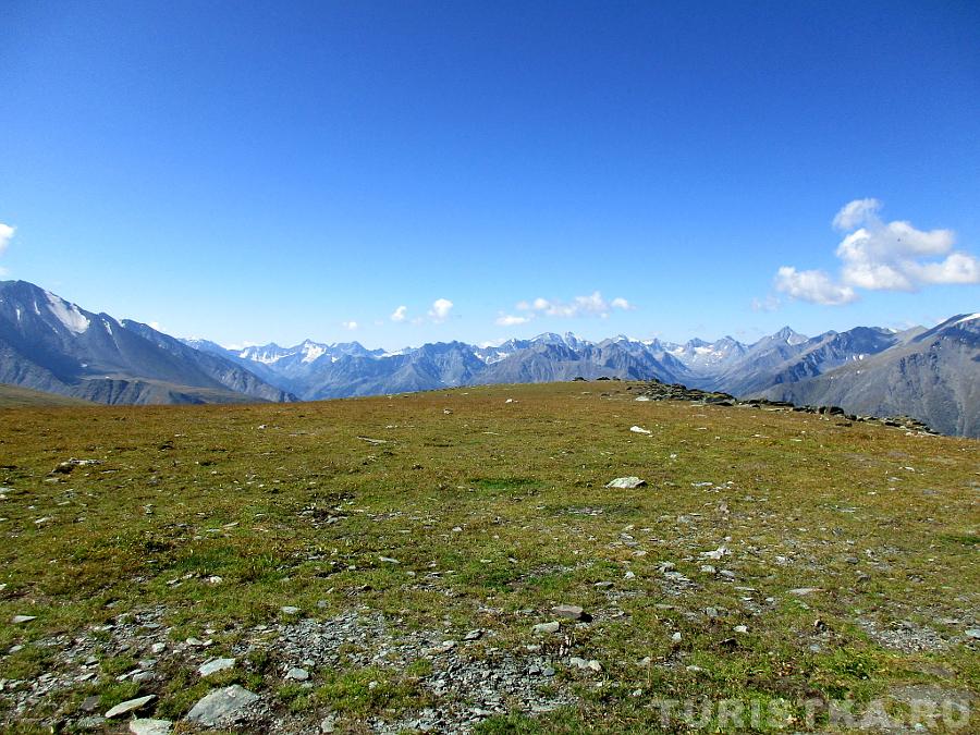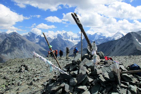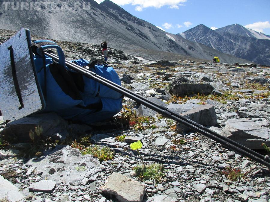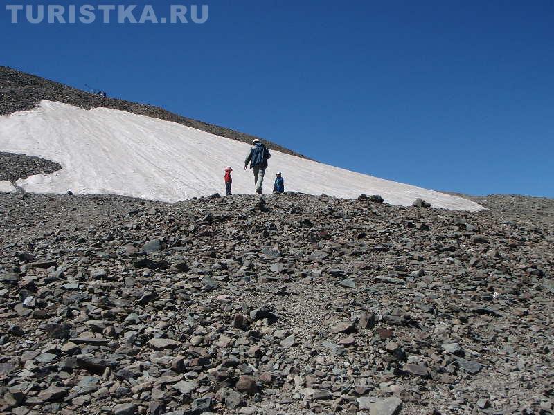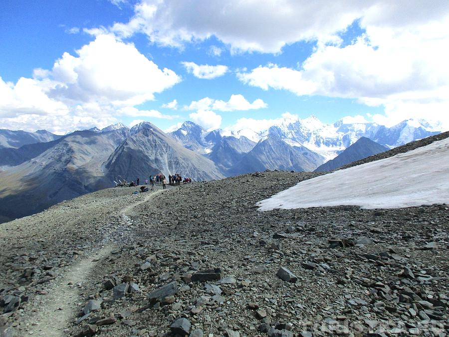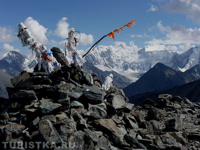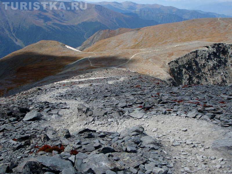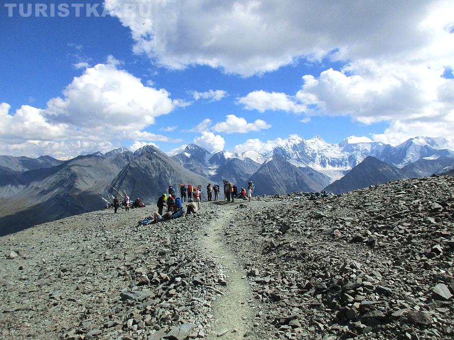 Перевал не является классическим "седлом", понижением в гребне. С перевала можно спускаться к Аккему, а можно, не доходя до перевала, пойти дальше вверх. Но летом, даже если поднялись выше, все равно увидите внизу площадку перевала и спуститесь к ней. А вот путешествуя зимой или весной, когда еще лежит снег, легко ошибиться и уйти или к скальным сбросам, или пройти выше перевала. На перевале стоит тур с палками, обвязанными белыми ленточками, небольшой каменный заборчик, огораживающий место, где можно поставить палатку и посмотреть закат и восход над Белухой. Рядом есть снежник, по нему здорово покататься и сфотографироваться.