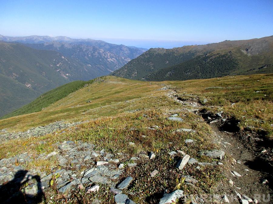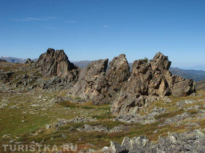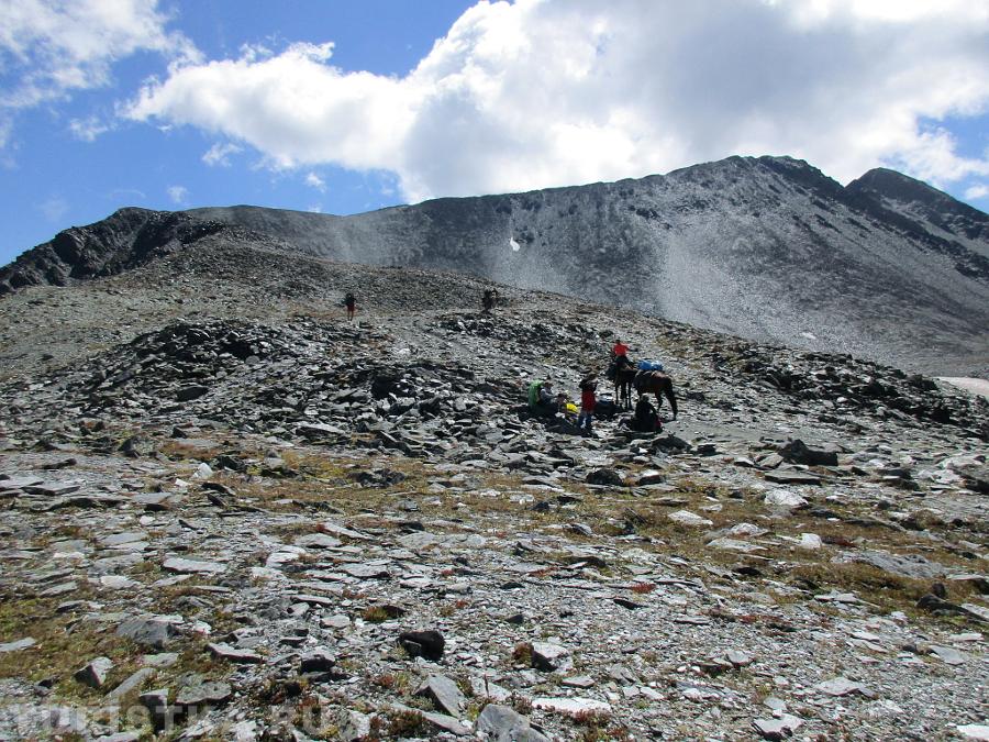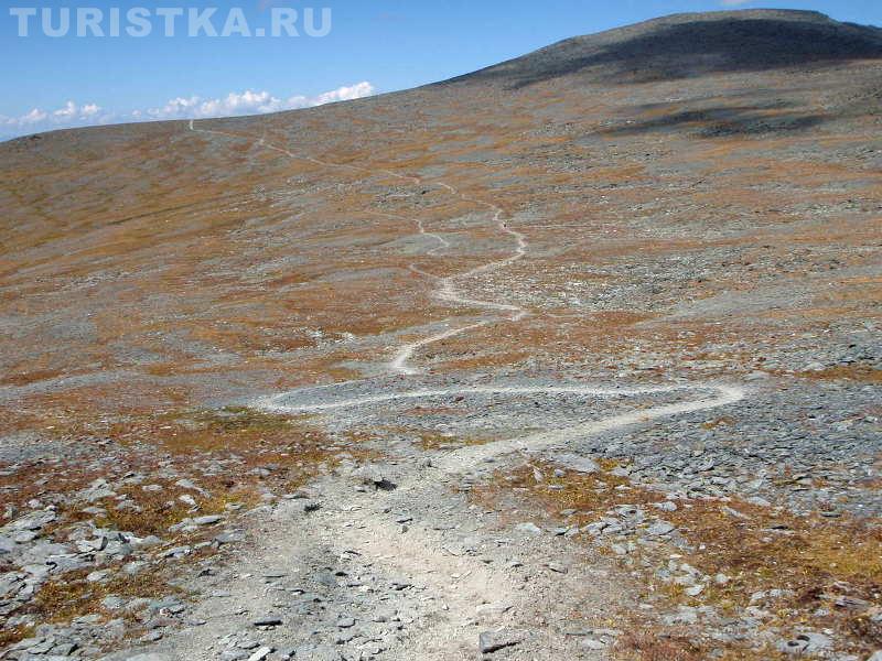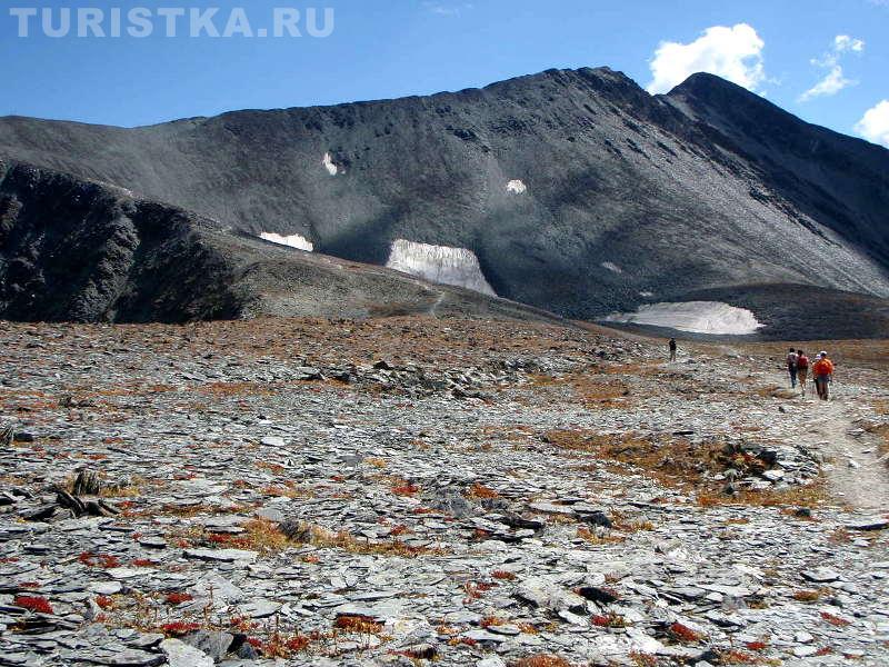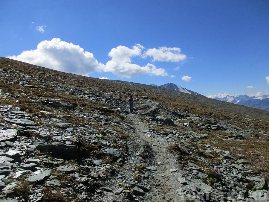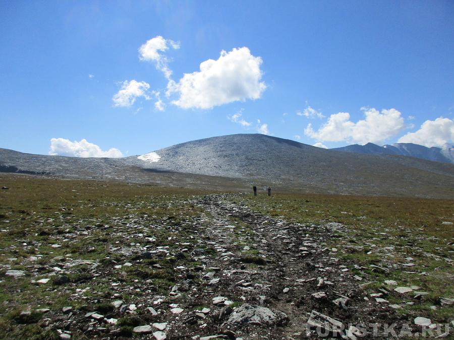 После Каменной избы снова идет три подъема на плоскогорья-ступеньки. На второй ступеньке есть сотовая связь, за это она названа "Телефонной будкой". Дальше связи нет, даже на перевале Каратюрек. По второму плоскогорью протекает много ручьев, есть топкие участки, по которым проходит тропа. И вот, наконец-то, заканчивается всякая трава и начинается подъем к перевалу по черным камням. Не зря название Каратюрек переводится с алтайского как "чёрное сердце". Остаются одни чёрные камни. Подъем крутой. Тропу летом хорошо видно. Перевал уже близко, и важно вовремя свернуть налево на развилке, так как дорожка может повести выше по гребню.