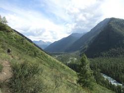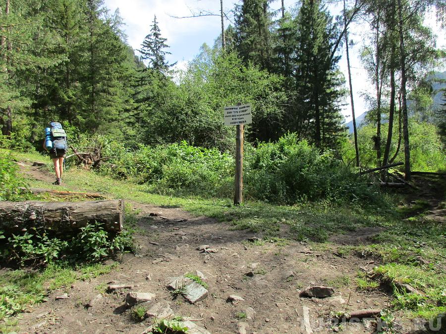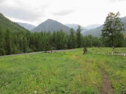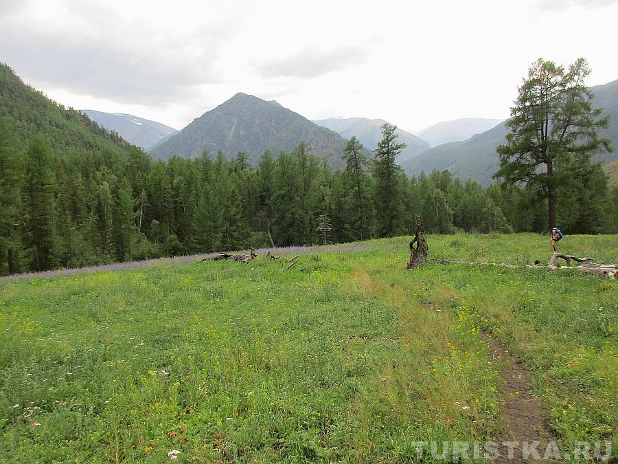 Набор высоты довольно большой. По пути открывается вид, от которого захватывает дух и хочется стать птицей и парить над долиной Кучерлы! Если повернуться к реке, на противоположном берегу виден довольно большой поток, впадающий в Кучерлу это р. Калагаш. Тропа идет дальше вверх. После крутого подъема начинается урочище Куйлю. Справа течет р. Куйлю. Дальше тропа идет мимо большой поляны с Салтарскими ключами (около ключа в землю воткнута табличка с названием). После поляны подъем по лесу и выход к горелому лесу (здесь есть места, где ловит МТС). Перед подъемом на перевал, который выводит из урочища Куйлю есть место для стоянки.