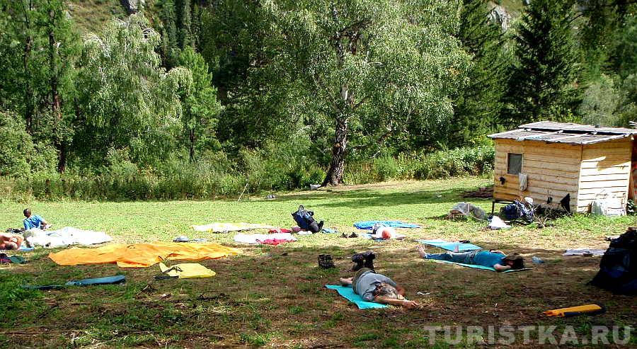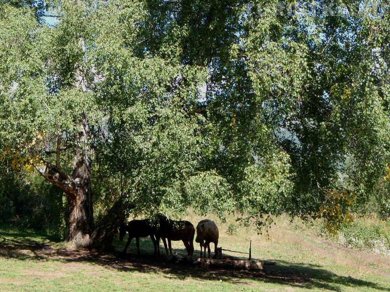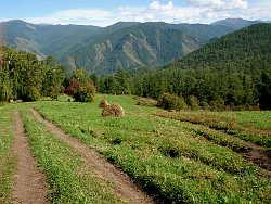 После спуска с перевала Кузуяк в сторону Белухи, путь идет по лугам с высокотравьем. Вдоль дороги часто встречаются заросли малины, смородины, ежевики. Примерно через два километра от перевала будет брод через ручей Кузуяк. Затем следует выход на сенокосные луга. Здесь открывается вид на горы за р. Ак-Кем. Совсем немного остается до стоянки "Три березы". От нижнего моста через Кучерлу до стоянки "Три березы" примерно 16 км. Путь проходится за один день. На стоянке можно переночевать в палатках, купить лепешек, чай. Здесь работает связь Билайн. У алтайцев, обслуживающих стоянку можно узнать, будет ли машина (ГАЗ-66) до Тюнгура, если идете от Белухи.