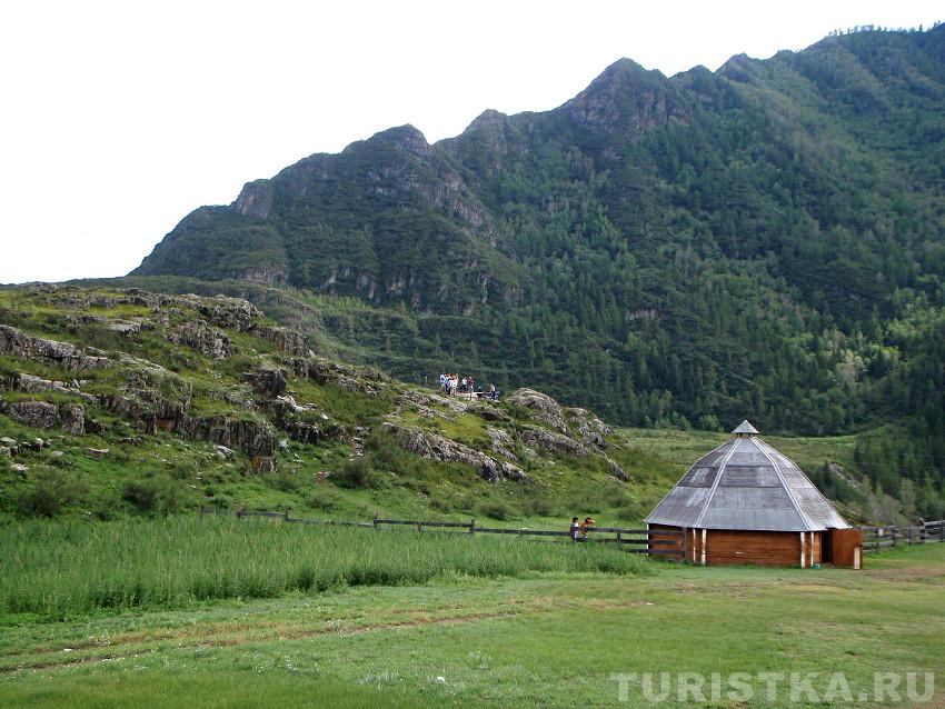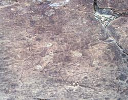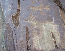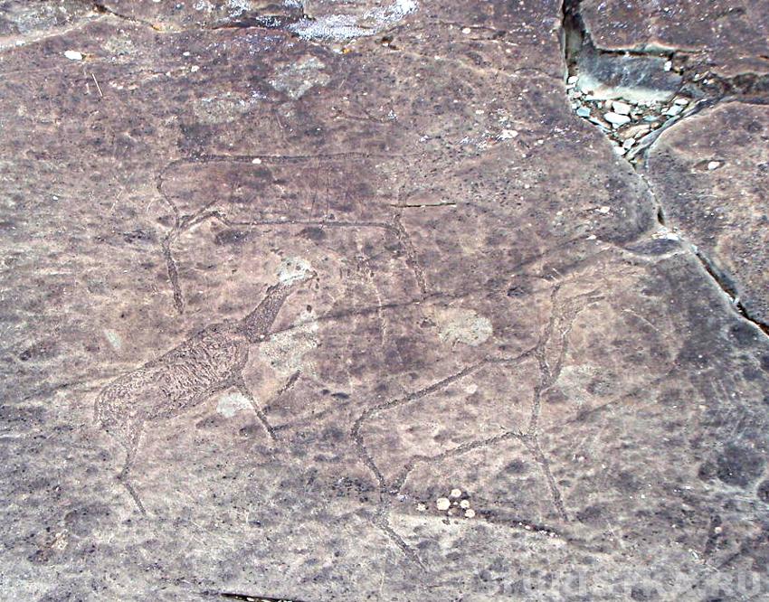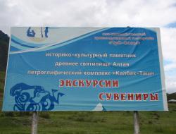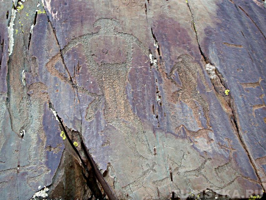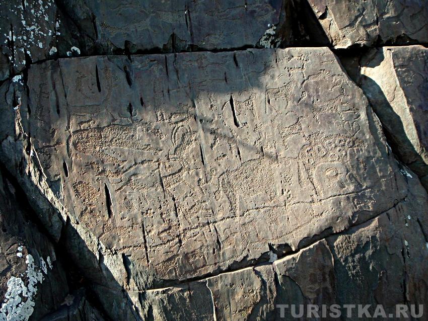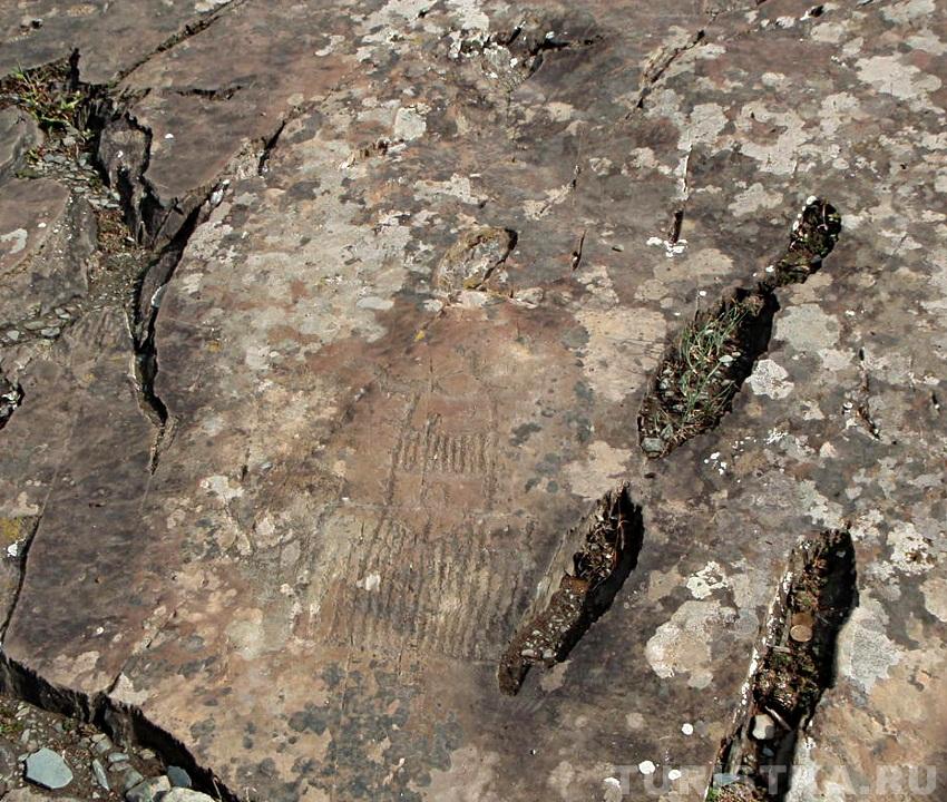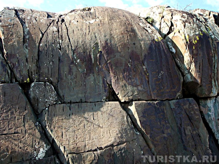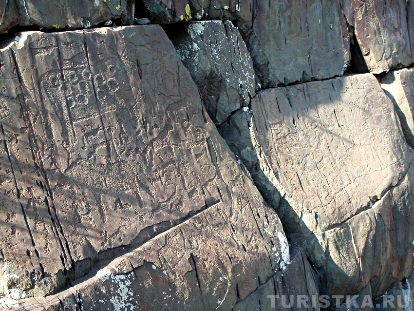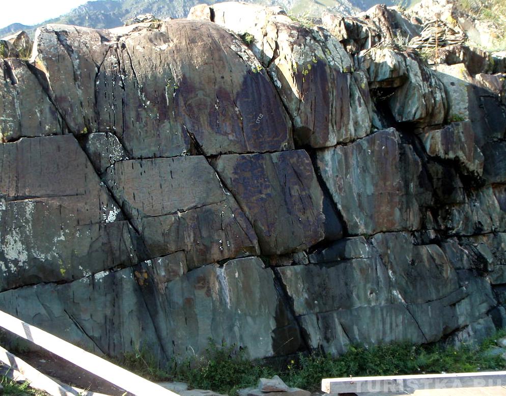 На плитах скальной возвышенности выбиты тысячи рисунков фигур животных, людей, сцен охоты. На большей части петроглифов эпохи неолита представлены крупные фигуры оленей и козлов. Самая многочисленная группа рисунков относится к эпохе энеолита-бронзы; сюда относятся стилизованные изображения женщин (часто рядом со зверем), колесниц, вьючных быков, погонщиков и воинов, фантастических хищников и домашних животных. Петроглифы скифского времени представлены сценами охоты на оленей, многочисленными животными — маралами, козлами, кошачьими хищниками, волками-собаками. На петроглифах древнетюркской эпохи изображены сцены охоты, изображения диких быков и медведей. Здесь найдено единственное на Алтае изображение лодки.