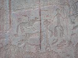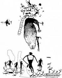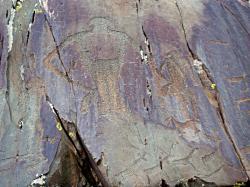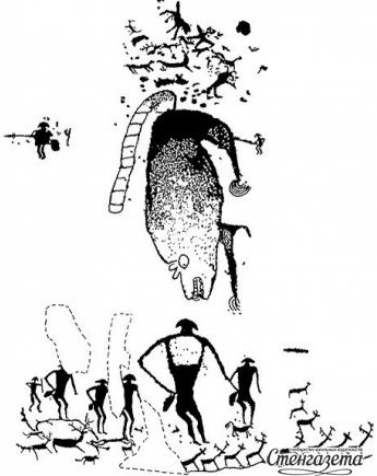 Одной из самых интересных является сюжетная группа с "хвостатыми" людьми, имеющими на голове полукруглые образования. Среди них выделяется великан с нарисованным на груди квадратом, который мог изображать вместилище души. Над хвостатыми людьми легко заметить огромного зверя с зубастой пастью. По одной из версий, это чудовище было поглотителем душ, которое очищало их от скверны перед вступлением в высший мир согласно восприятию мира той культуры. По другой из версий, рисунок шествия людей под мифическим зверем изображает обряд посвящения юношей в мужчин-воинов.