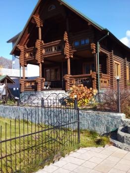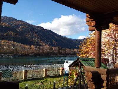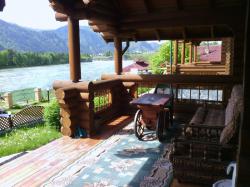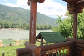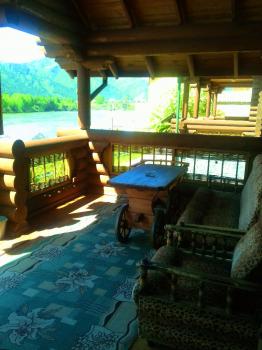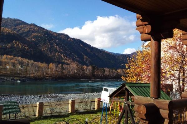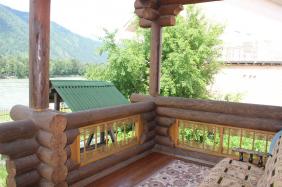 Вид на Катунь. Дом в охотничьем стиле, из оцилиндрованного кедра, сдается целиком. В нем 3 спальни на втором этаже с двухспальными кроватями, прикроватными тумбочками, шкафом. На первом этаже гостиная с мягкой мебелью, спутниковым ТВ; кухня-столовая, с электроплитой, большим холодильником, чайником, всей необходимой посудой. Санузел с душевой кабиной на первом этаже, горячая, холодная вода. Большая веранда с мебелью и видом на Катунь. Количество проживающих 6 человек.