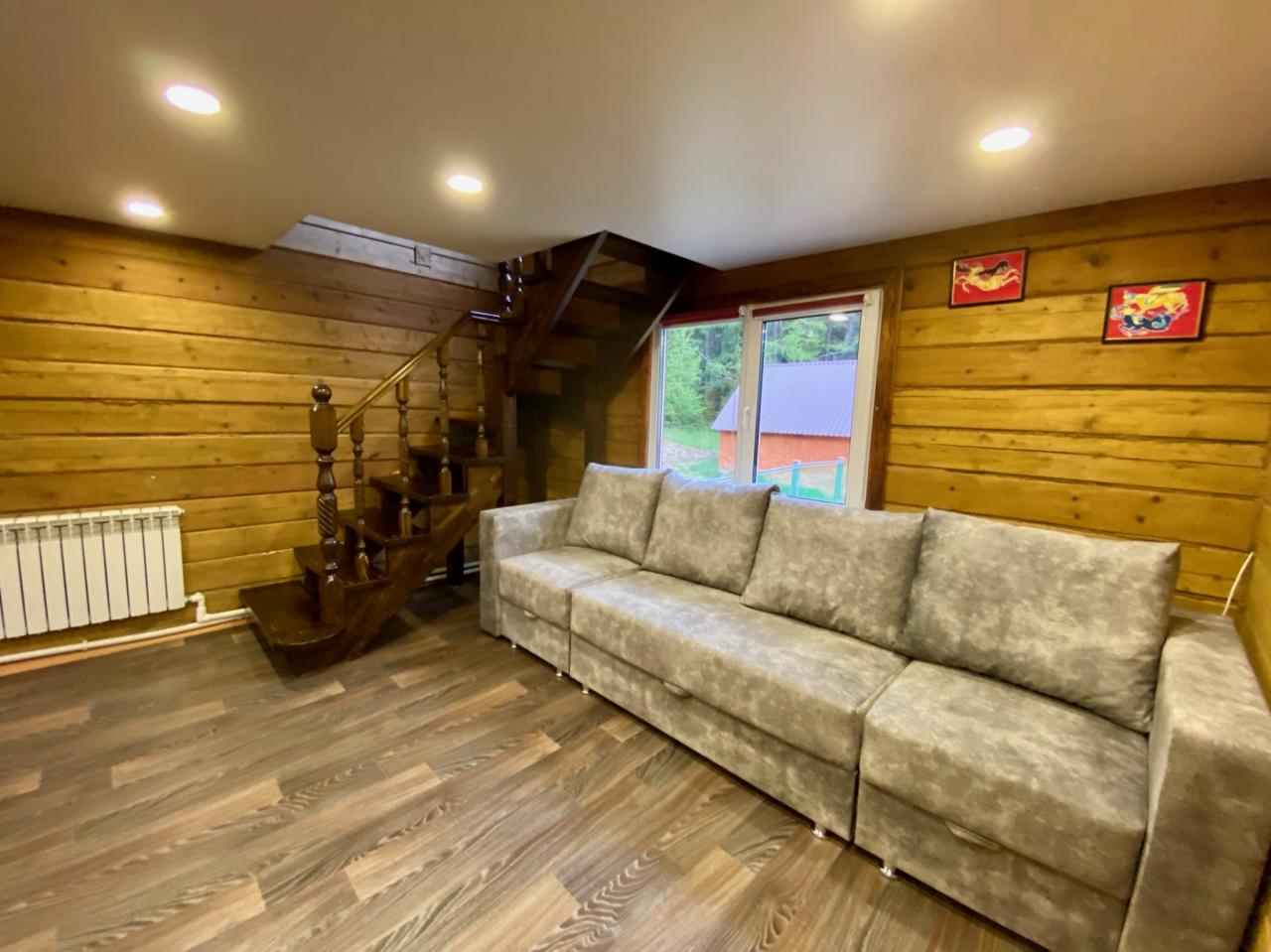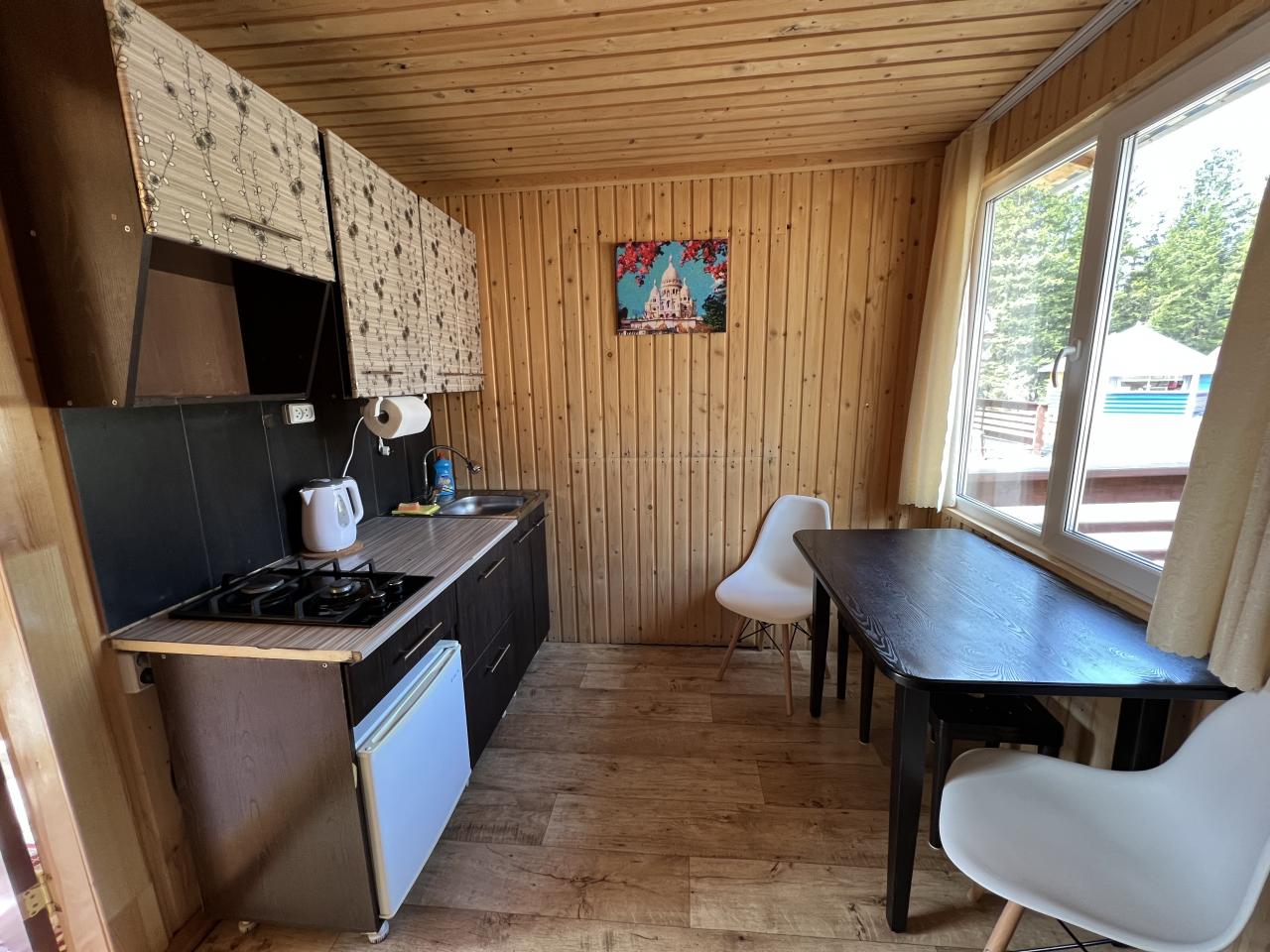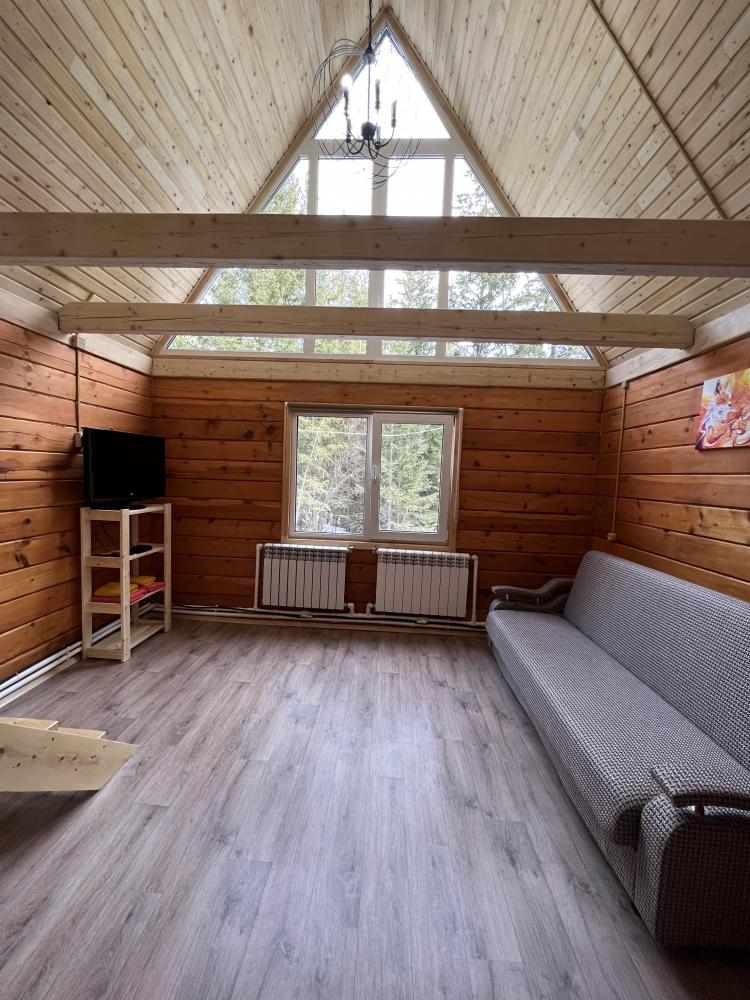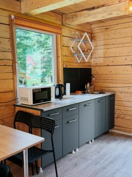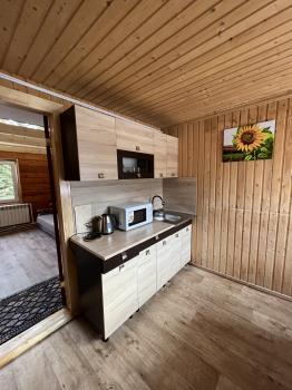 Также на первом этаже находится комната отдыха + кухонная зона, где расположены: кухонный гарнитур, набор посуды (минимальный на 6- человек), микроволновка, холодильник, стол, стулья, 2-хместный диван, телевизор.