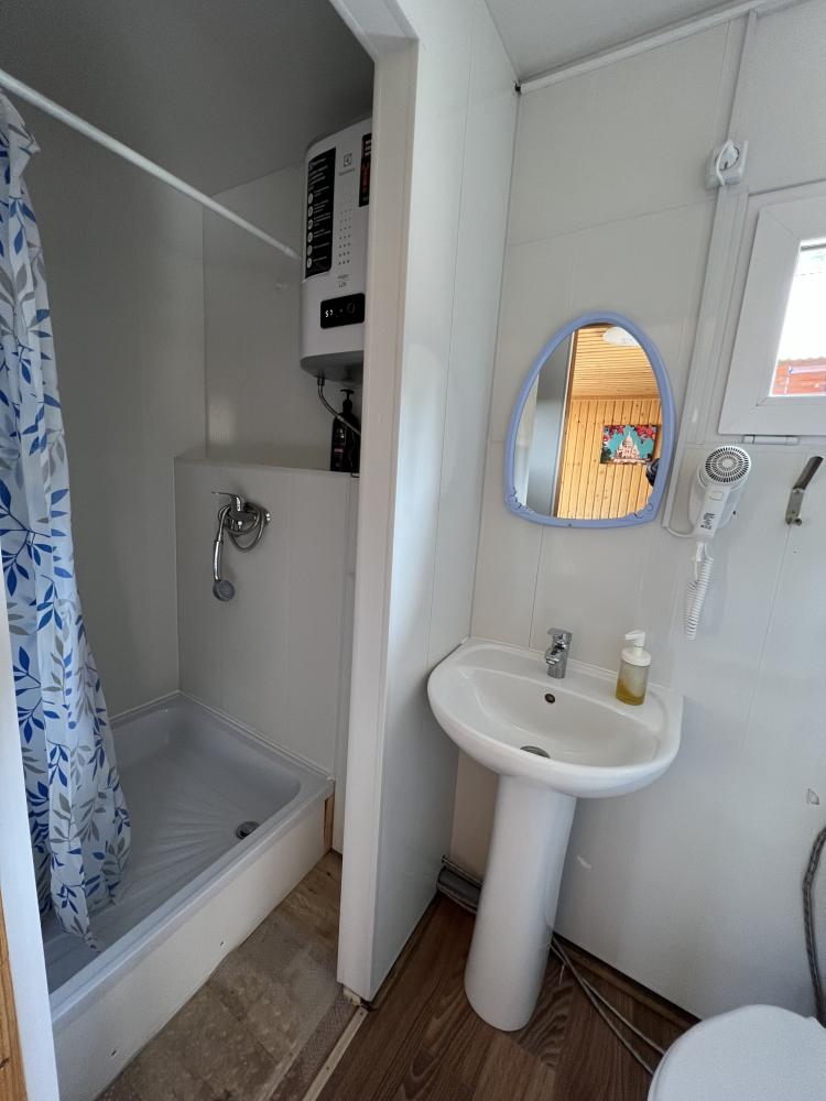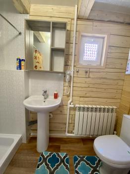В санузле: душевая кабина, раковина, фен, 4 больших полотенца и 1 для ног, горячая вода, зеркало, унитаз.