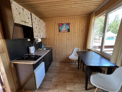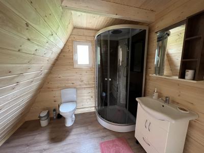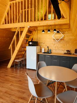 - Дом № 2,3 (2+2) — 7000 р. Дом рассчитан на размещение до 4 человек, цена указана за 2-х человек. В домике: на втором этаже открытая спальня в ней двуспальная кровать (ширина 160 см), одно одеяло евростандарта, прикроватные тумбочки, в просторной гостиной на первом этаже 2-х местный диван (два односпальных одеяла), комод, телевизор, отопление. Кухня в отдельной комнате в ней кухонный гарнитур, набор посуды (6 кружек, 6 ложек, 6 стаканов, 6 тарелок, 6 ложек и вилок, одна кострюля, одна сковорода, один электрический чайник, маленький холодильник, стол, стулья. В домике №2 газовая плита, в домике №3 электрическая плита, микроволновая печь. В санузле: душ, раковина, горячая вода, зеркало, унитаз. Доп. место 1000 р. человек.