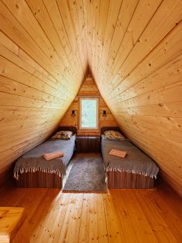 На 2-м этаже: спальня с открытой планировкой, 2 раздельные кровати ( ширина 80 см), 2 одеяла оноспальных,, прикроватные тумбочки.