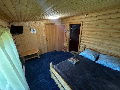 Стены из оцилиндрованного кедра, который сохраняет комфортную температуру в номере.