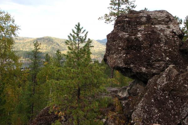 Тропа хорошо протоптана. В лесу тропа по заметной широкой просеке уйдет влево и приведет вас к роднику. В окрестностях родника тоже можно побродить. Здесь есть уютные красивые местечки и подъем в гору тоже есть, но все таки обычно возвращаются к тому месту, откуда повернули налево. Если бы не родник, то вам бы надо было идти направо. Сначала вы спуститесь в небольшой овраг с ручейком и большим валуном. Отсюда начинается подъем. Дальше указать точную тропинку сложно. Она то идет по земле и натоптана, то начинаются камни и тропа пропадает. Просто поднимайтесь вверх, разными путями вы придете к одному месту это выступающий вперед большой валун, который местные называют "Маяк". От "Маяка" уже видна цель вашего путешествия два больших камня, нижний с надписью. Местные жители называют эту композицию "Танк". Действительно очень похоже на танк. По курумнику поднимаетесь к "Танку".
