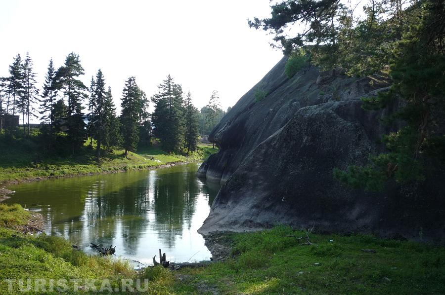 Не только окрестности села Турочак славятся своими пейзажами. Весьма живописный уголок природы располагается и в самом населенном пункте. Это небольшое озерцо, окруженное гранитными скалами весьма причудливой формы. Одна из них и дала название этому месту «Голова кита». Топоним весьма красноречивый скала действительно весьма напоминает своей формой кита.