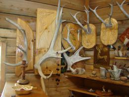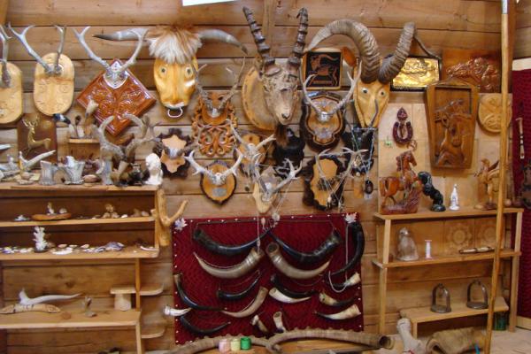 Представлены сувениры, созданные хозяевами и их детьми. Резьбой по дереву Сергей Танышевич занимался смолоду, но сейчас больше режет из рога и кости. Любовь Андреевна шьет национальные алтайские костюмы.