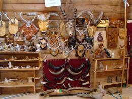 Очень много изображений лошади: это и скульптуры, и картины, вырезанные из дерева. Особенно выразительны и динамичны чеканные изображения лошади и всадника. Большую часть выставки занимают поделки из рогов животных оленя, яка, козерога. Это настенные панно с рогами, подставки для ручек, рога для вина, украшенные резьбой.