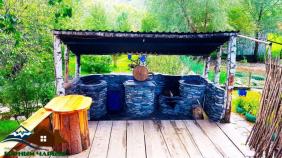 Своя беседка с мангальной зоной, общая кухня на территории..