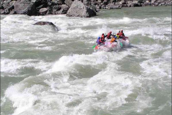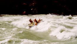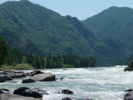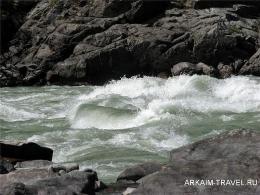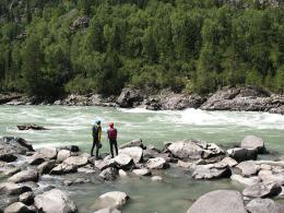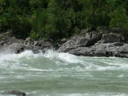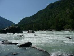 После того, как Катунь отвернула от Чуйского тракта и вы прошли Ильгуменский порог и Кадринскую трубу, идет длинный прямой участок реки, и справа в Катунь впадает небольшая речка Кузюр, затем Катунь поворачивает налево. Метров через 600-700 начинается первая ступень порога. Разведка порога идет по правому берегу. Есть возможность обнести порог и на скалах правого берега посмотреть, как проходят порог другие.
