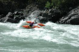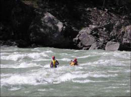 Вторая ступень заканчивается перед понтонным мостом, который смыло паводком и притащило сюда из района села Иня. Понтон лежит на правом берегу. Перед понтоном водников напоследок ждет мощный пульсирующий вал с опрокидывающей верхушкой.