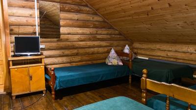 Четырехместный номер на второми этаже с балконом (одна двуспальная кровать, две односпальные кровати, тумбочка, стол, телевизор). Возможно установить два дополнительных места (две односпальные кровати).