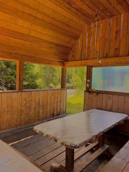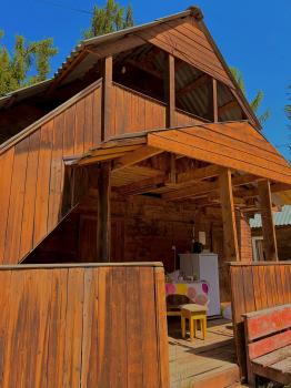 - Летняя кухня-столовая с видом на слияние рек бесплатно (холодильник, газовая плита, летний водопровод с раковиной, чайник, обеденные столы со стульями и диван)