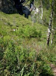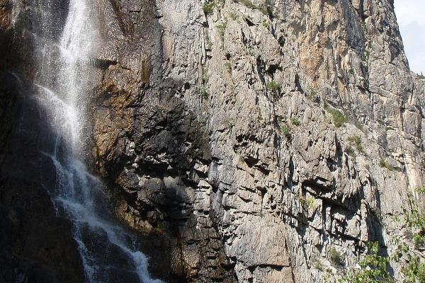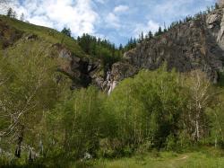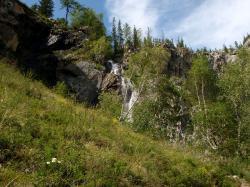 От дороги кажется, что тонкий поток течет вертикально по "щеке" скалы, напоминая дорожку девичьих слез. К водопаду идет натоптанная тропинка, которая проходит через небольшой березовый перелесок. В лесу течет ручей это вода после водопада. Чтобы увидеть падение воды вблизи, надо подняться к скалам, немного попотеть. Небольшая речка, которая образует водопад, есть на карте, но не подписана. Длина ее немного больше двух километров. Она впадает в Чую.