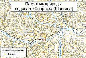 Водопад выступает естественным географическим центром окружающей природоохранной территории, которая занимает площадь в 78,5 га. Окружающие его ландшафты достаточно типичны для долины Коргона. Это сочетание альпийских лугов с лиственными и еловыми лесами, относительно разреженными, и скальными выходами, замыкающими реку в узкую долину. Кое-где имеются мохово-лишайниковые участки, с характерной тундровой растительностью. Согласно положению, регламентирующему использование природных памятников Алтайского края, на территории «Водопада Спартак» разрешается проведение экскурсий, прогулок, экологический туризм. Водопад активно используется водными туристами для проведения тренировок.