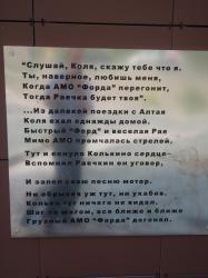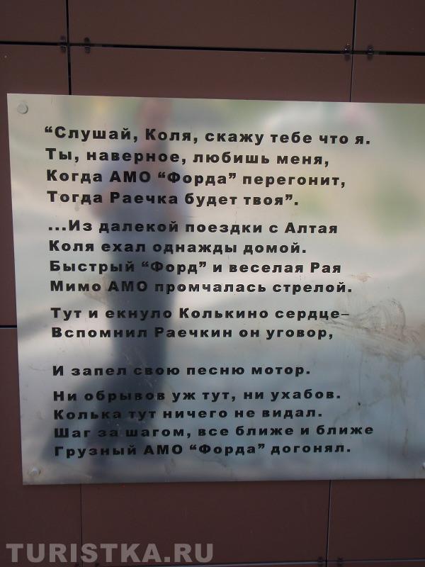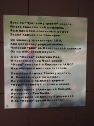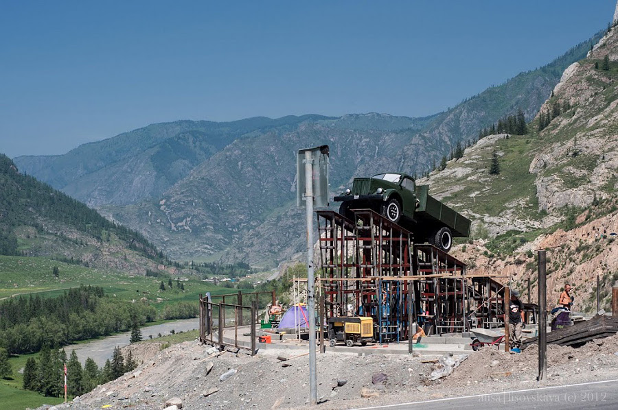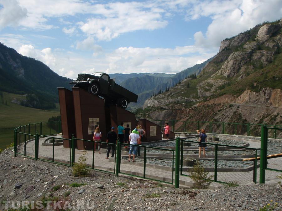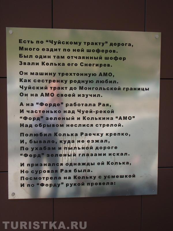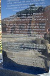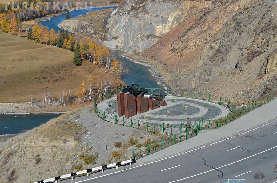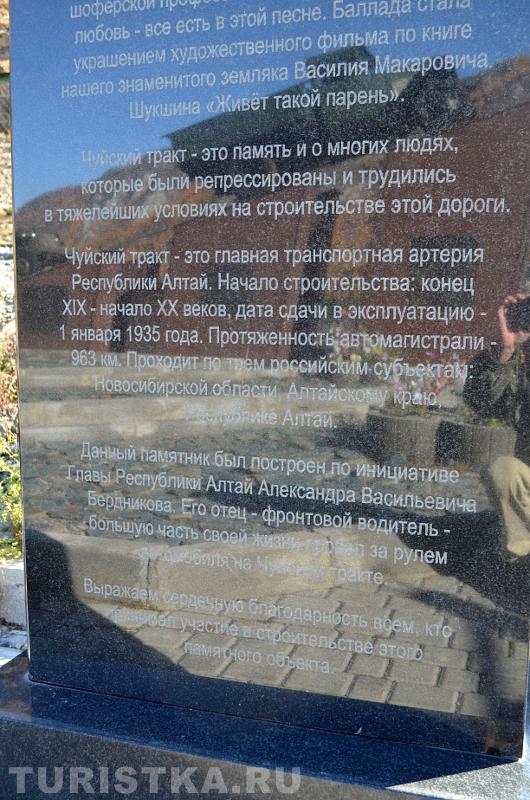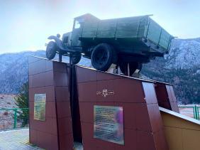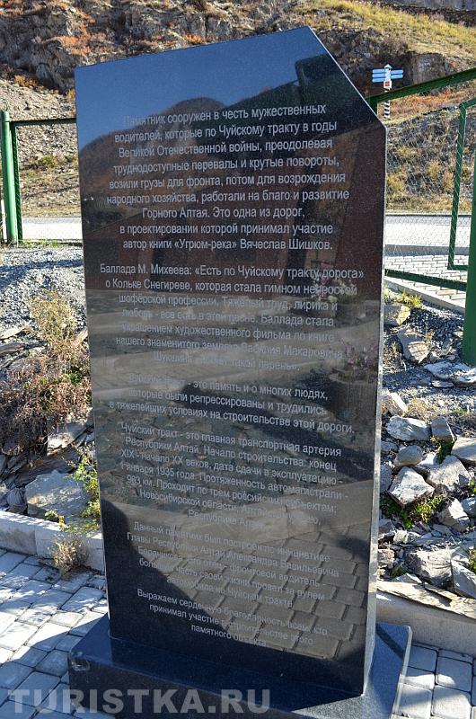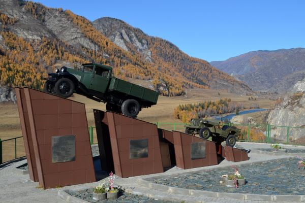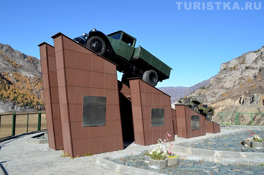 Весь монумент посвящен мужественным шоферам Чуйского тракта, которые преодолевая перевалы и бомы работали в Горном Алтае.