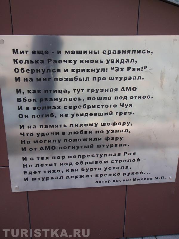 В 2012 г., в год 90-летия присвоения Чуйскому тракту статуса дороги государственного значения, на месте штурвала и сваренных деталей от машины по инициативе правительства Республики Алтай поставили новый памятник стремящийся вверх по постаменту ЗИС. На трех опорах постамента выгравированы слова песни "Есть по Чуйском тракту дорога". Линия постамента повторяет линию горного хребта. Круговые дорожки вокруг машины символизируют зигзаги Чуйского тракта. В сентябре 2014 г. на постамент вместо ЗИСа поставили АМО (машину, которую в песне Колька "как сестренку родную любил") и следом за АМО взбирается "Виллис" американский автомобиль высокой проходимости. И хотя это не Форд, на котором в песне "работала Рая", но тоже неплохо смотрится и сыграл свою роль на дорогах страны в ВОВ.
