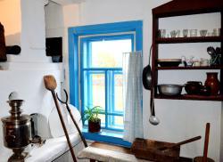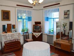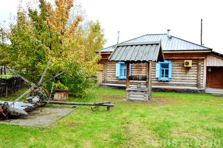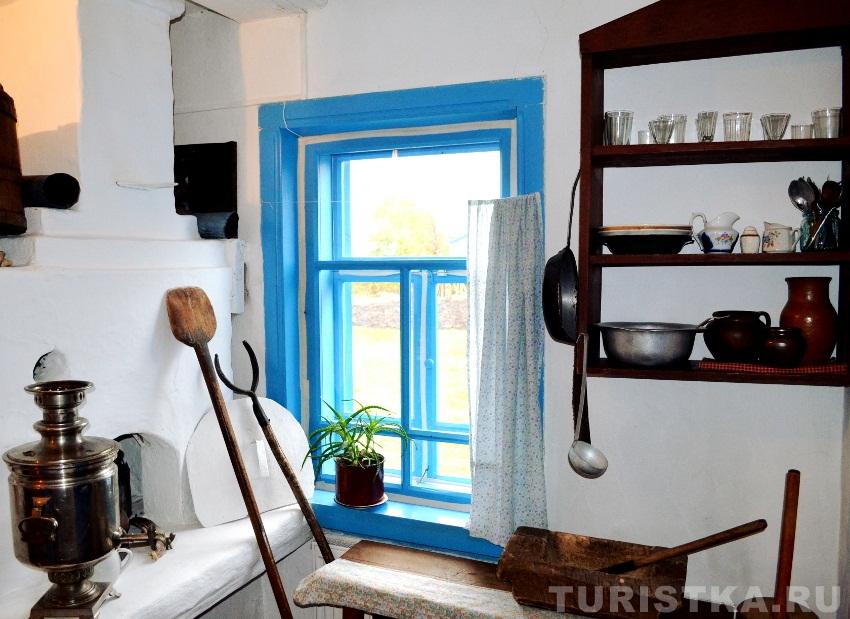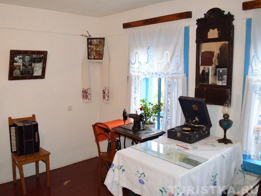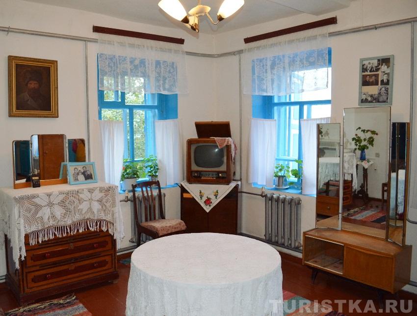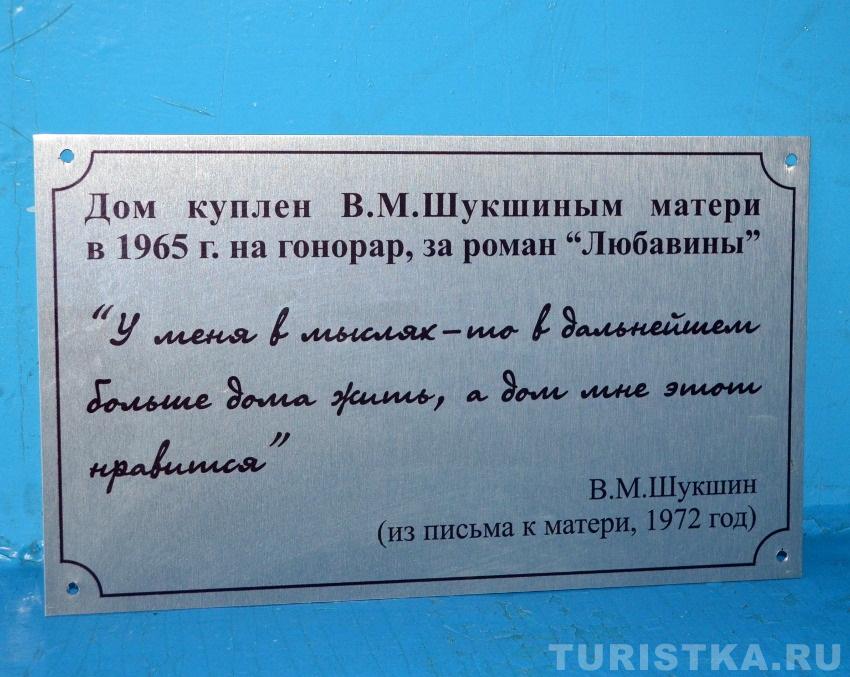 В доме, где прошли детские и юношеские годы В. М. Шукшина, представлена часть обстановки дома периода 50-60 гг.: печь с керосиновой лампой на краю, кухонная утварь, этажерка с книгами, сундук, вышитые занавески на окнах с геранью.